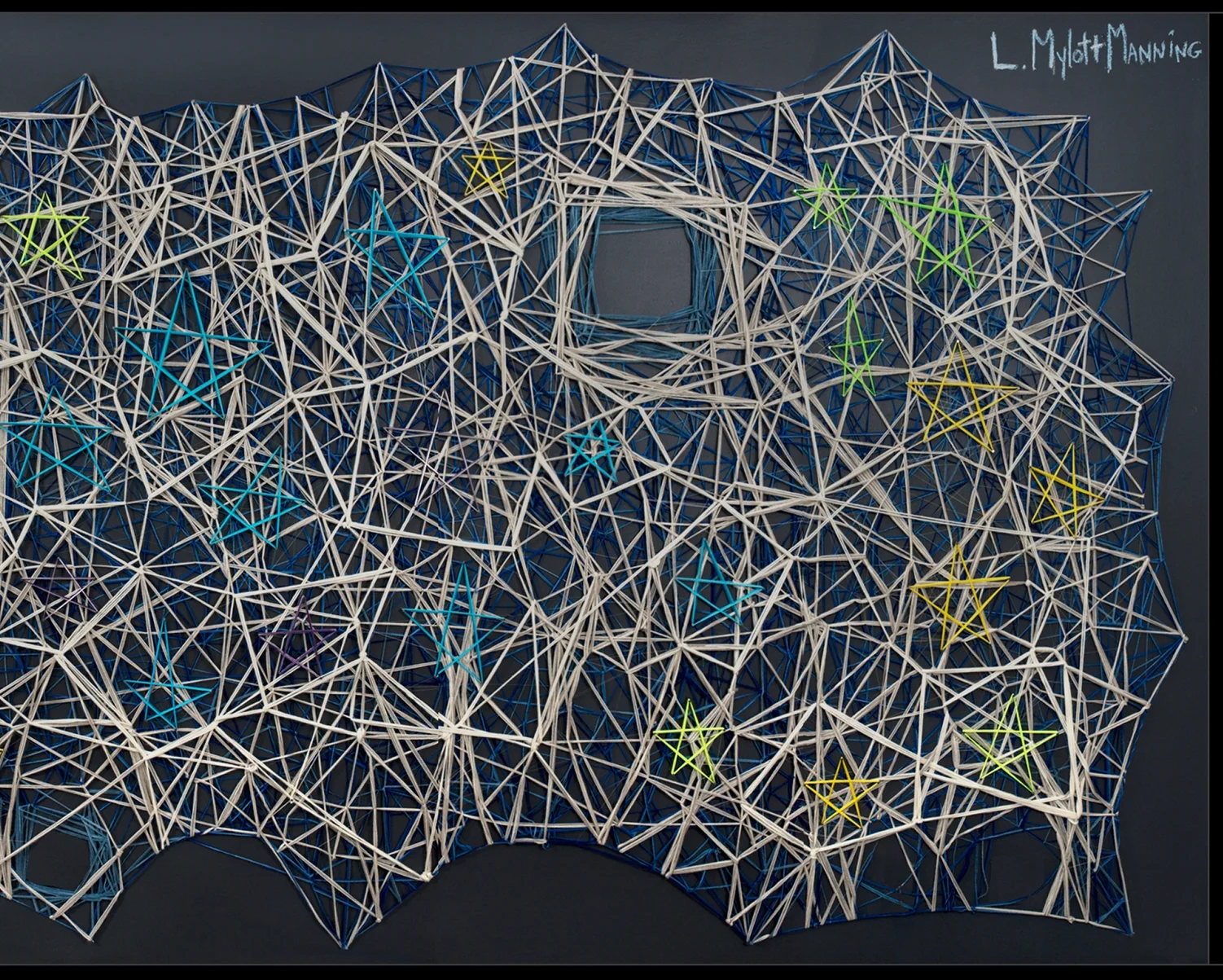 I explore interconnectivity, intuitive mark making, and metaphysical networks of energy in my works-on-canvas. My process is meditative and involves layering of paint and tape and hand stitching thread into the canvas with an industrial needle. I encourage the viewers of these works to apply personal metaphors to find meaning, such as an organized chaos, a mapping system or the human relationship to a larger cosmic picture.