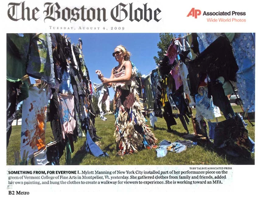 Over the course of seven days, Manning transforms the window front chashama gallery space into a jungle of thread and fabric. The work is a continual performance, centering on a woman entwined in hundreds of spools of thread. These spools are constantly being fed into multiple sewing machines, operated by women stitching seemingly endless lengths of fabric. 700 Spools of Thread (Keep it Together) connects with its immediate surroundings within the garment district offering a street view glimpse into the often forgotten and anonymous world of seamstresses. Additionally, it highlights the multiple sometimes conflicting roles women are expected to play in today’s society.